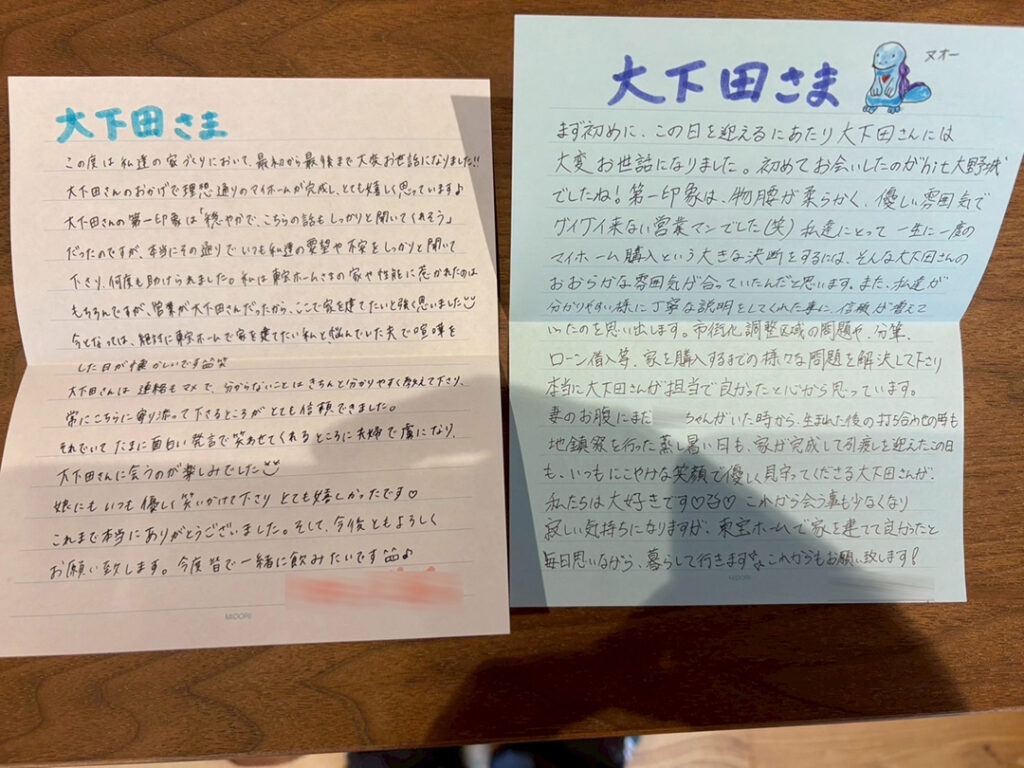 私は東宝ホームさまの家や性能に惹かれたのはもちろんですが、営業が大下田さんだったから、ここで家を建てたいと強く思いました 。